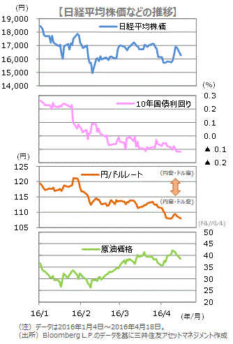 ■今回の調整は、円高圧力を緩和すると期待された産油国会合が不調に終わったことが主因と思われます。熊本・大分地震によるサプライチェーンなどへの懸念も警戒されました。(熊本・大分地震の発生に際し、犠牲となられた方々とご遺族の皆様にお悔やみと、被災された方々へのお見舞いを申し上げます)。
