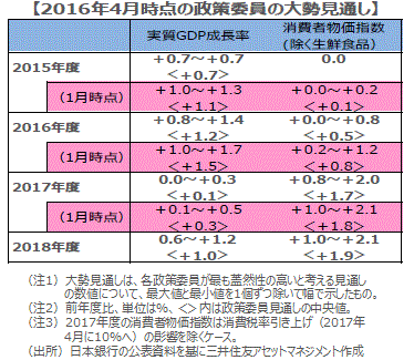 ■景気の基調判断は、1月の展望レポートで示された見方よりもやや弱まりました。2016年度のGDP見通しが+1.2%と1月時点より下方修正されました。物価については目標の2%程度への達成時点を2017年度前半から2017年度中へと修正しました。