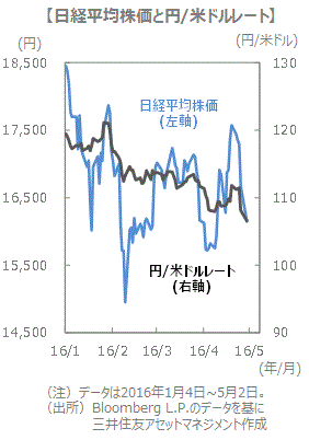■今回の調整は、4月28日の金融政策決定会合で日銀が追加金融緩和を見送ったため、急激な円高米ドル安が進み、それが嫌気されました。円/米ドルレートは、14年10月以来の106円台を付けました。