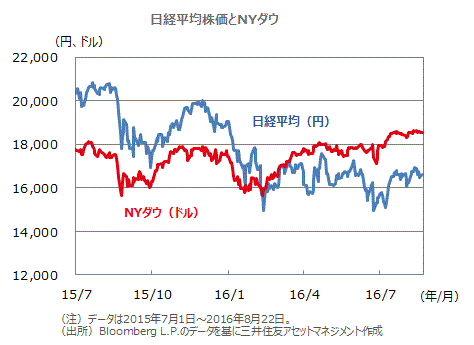 ■8月の世界の株式市場は、米国株式市場で、主要株式指数が揃って史上最高値を更新するなど、総じて堅調に推移しています。こうした中、日本株式市場は、日経平均株価が16,000円台で一進一退の動きにとどまっています。日銀の上場投資信託(ETF)買い期待が下値を支える一方、円相場が一時1ドル=100円を突破するなど、円高が株価の重石となっています。