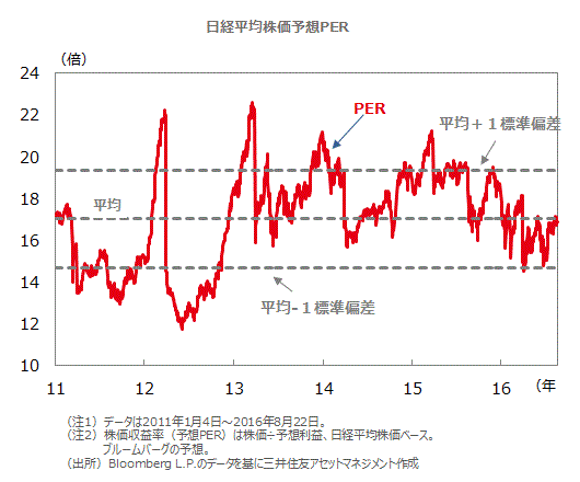 ■一方、日経平均株価の株価収益率(予想PER、ブルームバーグ集計)は、過去の平均並みとなっています。PERで見た日本株式のバリュエーションは割高水準ではありません。