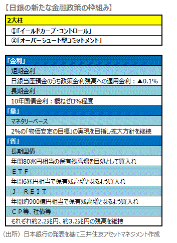 ■日銀は、9月21日の金融政策決定会合で、2%の「物価安定の目標」をできるだけ早期に実現するため、「長短金利操作付き量的・質的金融緩和」を導入することを決定しました。これは①長短金利の操作を行う「イールドカーブ・コントロール」、②インフレが2%を安定的に超えるまで、マネタリーベースの拡大方針を継続する「オーバーシュート型コミットメント」を2大柱としています。