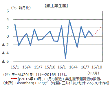 ■9月の鉱工業生産指数(速報値)は前月比+0.0%と、市場予想(ブルームバーグ集計)の同+0.9%を下回りました。熊本地震の影響や英国の欧州連合(EU)離脱選択など、生産を抑制する材料が緩和する中で、月次では振れを伴いつつも、生産は緩やかに持ち直していると考えられます。