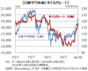 ■先週、米国では利上げが実施され、来年は従前の予想より早いペースでの利上げが想定されている一方、日銀は当面金融政策の現状維持が見込まれます。トランプ次期大統領が選出されて以降、株高、円安となっていますが、今後も内外金利差の拡大に連れて円安傾向となる可能性があります。