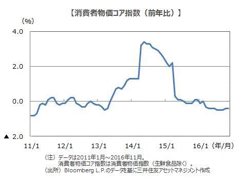 ■16年11月の消費者物価指数(生鮮食品を除く、以下コア) は前年比▲ 0.4 % と、市場予想(▲0.3%)を下回り、前月と同じマイナス幅にとどまりました。エネルギーのマイナスが引続き縮小(10月▲7.9%→11月▲6.7%)しましたが、それ以外の通信、教養娯楽、被服及び履物などで伸びが鈍化ないしマイナスが拡大しました。企業の価格設定行動は依然として慎重で、原油高要因を除くと物価の基調は弱い状態が継続しています。