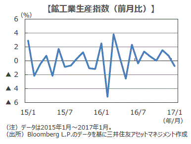■1月の鉱工業生産指数は前月比▲0.8%と市場予想(同+0.4%、ブルームバーグ集計)を下回り、6カ月ぶりに減速しました。電子部品・デバイス工業など一部を除き、幅広く減速しましたが、中国経済の安定などを背景とした海外景気の拡大継続から輸出は増加基調にあると考えられます。このため、1月の減産は一時的な動きと見られます。