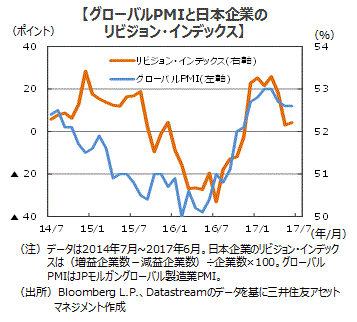 ■6月は米国や中国の製造業「購買担当者景気指数(PMI)」が事前予想を上回るなど、今後グローバルベースで製造業PMIが上昇局面入りする可能性があります。グローバルな景況感と、日本企業の収益見通しの上振れ度を見るリビジョン・インデックスは密接に関係しており、グローバルな景況感が上向いて来れば、業績の上振れ期待も高まると思われます。