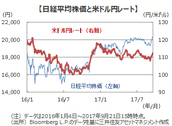■日銀は今後も2%の物価目標の達成に向けて、現状の金融緩和を継続していくと見られます。一方で、米国は20日の連邦公開市場委員会(FOMC)で10月以降の保有資産の削減を決定しました。今後、ゆっくりしたペースながら、追加利上げを実施すると見られます。この金融政策のスタンスの違いは今後も続き、日米金利差は拡大する方向にあると見られます。日経平均株価は円安進行などを受けて、21日に20,347.48円で終了し、約2年1カ月ぶりの高値となりました。今後も、金利差拡大は円安・株高要因になりそうです。