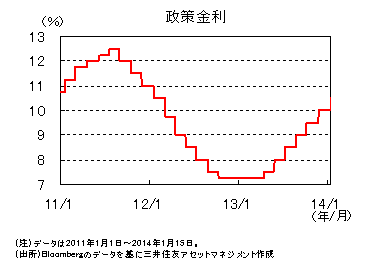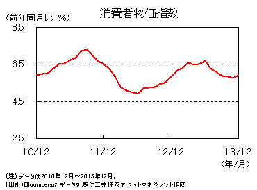 2013年12月の消費者物価指数の上昇率は前年同月比+5.91%となり、市場予想(同+5.81%)を上回りました。中銀は、物価が上振れした主な要因として、ブラジルレアルのこれまでの下落、賃金の上昇、運輸関連費用の値上がりなどを挙げており、金融引き締め姿勢を当面維持する見込みです。