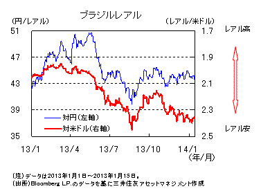昨年10月末以降、レアルは米ドルなどに対し下落傾向となり、足元でも上値の重い展開が続いています。財政収支の悪化、成長率の伸び悩み、国債の格下げ懸念などが主な要因です。加えて、12月中旬には米国で量的金融緩和策(QE3)の縮小が決定されたことも、レアル安要因になりました。