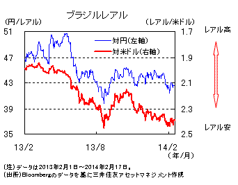 昨年10月末以降、レアルは米ドルなどに対し下落傾向となりました。財政収支の悪化、経済成長率の伸び悩み、国債の格下げ懸念などが主な要因です。加えて今年1月下旬には、アルゼンチンペソの急落もレアル安要因になりました。