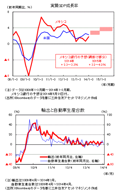 中銀は、5月21日に公表した「インフレ・レポート」で実質GDP成長率の予想を2014年は前年比+2.3%~3.3%(従来は同+3.0%~4.0%)、2015年は同+3.2%~4.2%(変更なし)としました。史上最低水準の政策金利、政府の積極的な財政政策、米国景気の持ち直しなどが下支えとなり、メキシコの経済成長率は緩やかに上昇すると見込まれます。