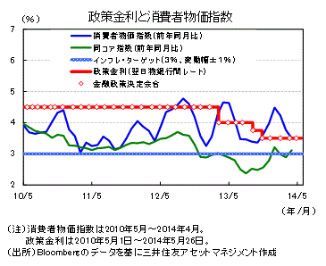 消費者物価指数は1月と2月に一時中銀のインフレ・ターゲット(年+3%、変動幅±1%)の上限4%を上回りましたが、3月から上限を下回り、4月は前年同月比+3.5%となりました。中銀は、年初のインフレの加速を公共料金の引き上げや新税制などによる一時的なものと考えています。今後について中銀は、食品価格の変動や前年との比較による効果などから同+4.0%を数カ月間上回る可能性があるものの、年末には同+4%を下回り、2015年は同+3%を若干上回る水準に落ち着くと予想しています。