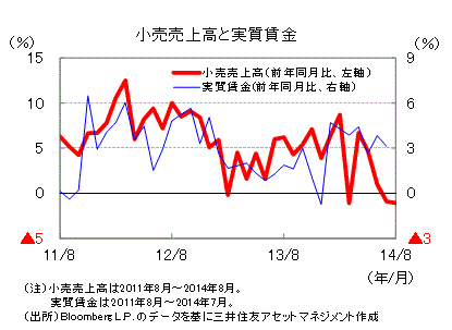 ■8月の小売売上高は前年同月比▲1.1%と、2カ月連続のマイナスになりました。ただし、前月比は+1.1%と、6月、7月のマイナスからプラスに転じました。消費はサッカー・ワールドカップの開催中に落ち込みましたが、終了後に持ち直しました。賃金の上昇などを背景に、消費が景気全体を下支えすると期待されます。