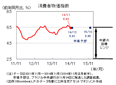 ■中銀が11月24日に発表した調査結果によると、物価上昇率の市場予想は2015年12月に前年同月比+6.45%と高止まりが続く見込みです。市場では、中銀は景気低迷に配慮しながらも、次回会合(12月2日~3日)以降も利上げを続けるとの見方が大勢です。こうしたなか、ルセフ政権の経済政策に注目が集まります。