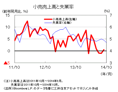 ■9月の小売売上高は、前年同月比+0.5%と、3カ月ぶりのプラスとなりました。また、10月の失業率は4.7%と、2カ月連続で低下しました。消費は勢いを欠くものの、堅調な雇用情勢が今後も下支え要因になりそうです。