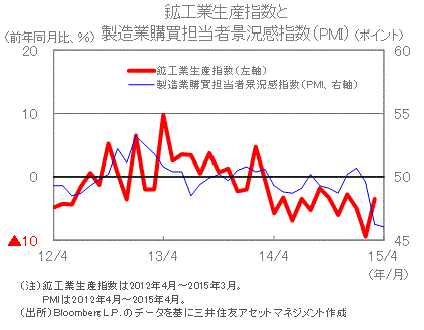 ■3月の鉱工業生産指数は前年同月比▲3.5%と、13カ月連続のマイナスになりました。また、製造業購買担当者景況感指数(PMI)は46.0と3カ月連続で好不況の境目の50を下回り、製造業の低迷が続いています。