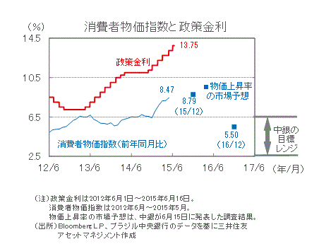 ■5月の消費者物価指数は前年同月比+8.47%と、2014年12月の同+6.41%を直近の底に5カ月連続で上昇しました。電気料金の引き上げや干ばつによる食品の値上がりなどが要因となり、物価上昇率はブラジル中央銀行(以下、中銀)の目標(年+2.5%~+6.5%)の上限を上回っています。