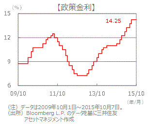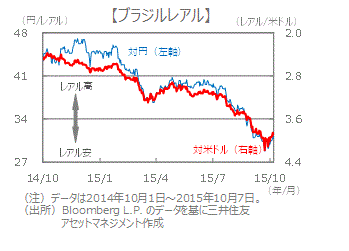 ■ブラジルレアルは、中国の景気減速と米国の利上げ観測といった海外要因や、国内景気低迷と財政不安などが影響し、9月に入り下落傾向を強めていました。9月下旬に対円で史上最安値(1レアル=28円台)を付けて以降持ち直しつつあります。