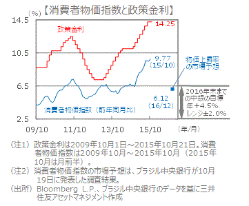 ■足元の消費者物価は、公共料金の大幅な引き上げや食品の値上がりなどの影響から、前年同月比+10%近い伸びが続いています。中銀はレアル安による物価の押し上げも警戒しており、財政再建の取り組みが進まずレアル安圧力が強まる場合には、さらなる利上げも辞さない姿勢です。