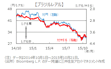 ■レアルは、9月下旬以降反転上昇傾向にあります。政府の財政再建策の見直し、中銀のレアル安定化策の強化、米国の利上げ見送りなどが背景です。ルセフ大統領は10月はじめに内閣改造を実施して連立与党内の結束を固め、財政緊縮の取り組みを続けています。