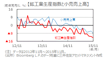 ■15年11月の鉱工業生産指数は、前年同月比▲12.4%(前月は同▲11.1%)、同月の小売売上高は同▲7.8%(前月は同▲5.7%)と、いずれもマイナス幅が拡大しました。