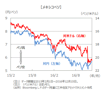 ■予想を上回る利上げを受けて、ペソは対米ドルで反発しました(15日、NY市場)。ペソは、トランプ次期米大統領の通商政策や財政・金融政策をにらみながら、当面落ち着きどころを探る展開が見込まれます。