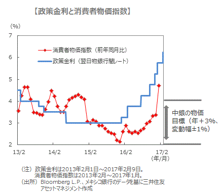 ■メキシコでは、2016年10-12月期の実質GDP成長率が前年比+2.20%となり、設備投資や輸出を中心に景気はここ5年間程度の水準と比較して低成長となっています。一方で、上述の通り、エネルギー価格の上昇や通貨安の影響により2017年1月の消費者物価指数は前年同月比で+4.72%の上昇と前月の同+3.36%から大きく上昇しました。1月に見られたインフレ率の高まりが今後も持続する可能性は低いと考えられますが、当面はインフレの高止まりが見込まれます。