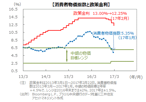 ■17年1月の消費者物価指数は前年同月比で+5.35%と一段と鈍化し、インフレ沈静化の傾向が続いていることが確認されました。中銀は声明で、最近のインフレ率の動向は予想以上に好ましいと評価し、市場のインフレ予想の低下や、今後も中銀の予想以上にインフレが鈍化する可能性も指摘されました。