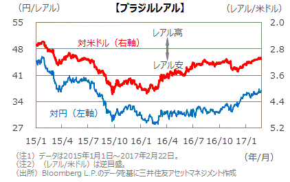 ■レアルは、16年11月の米大統領選でトランプ氏が勝利した際に一時的に対米ドルで下落しましたが、その後は、資源価格の上昇やブラジル政府による財政再建への期待感、あるいは利下げ後も高金利通貨としての魅力があることなどから、足元では対米ドル、対円ともに上昇基調となっています。また、金融緩和も通貨の魅力度を低下させるというより、ブラジル景気の回復要因として市場から好意的に受け止められています。今後も、これらのような要因を背景にレアルは堅調な動きが続くと予想します。