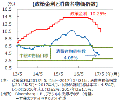 ■中銀は、物価の予想調査などに基づくと、2017年は前年比+4.0%、2018年は同+4.6%と、中銀の物価目標レンジ(同+4.5%±1.5%)に収まると見ています。また、こうした物価予想から当面は利下げが続き、2017年末の政策金利は8.5%まで引き下げられ、2018年末までその水準が続くと見られています。