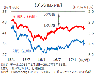■ブラジルでは、2016年5月のテメル政権誕生以来、経済・財政改革や、インフレ率のめざましい低下が進み、通貨レアルも堅調に推移してきました。しかし、足元ではテメル大統領に辞任・弾劾の可能性が浮上し、政治に先行き不透明感が出てきています。このため、財政再建や年金改革などが滞る恐れもあり、利下げはこれまでより緩やかなペースになると見込まれます。また、今後は政治リスクがレアルの不安定要因となりそうです。
