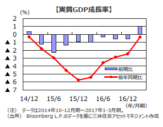 ■1日発表された2017年1-3月期の実質国内総生産(GDP)は前期比1.0%増となり、9四半期ぶりにプラス成長に転じました。前年同期比では▲0.4%と依然マイナスですが、2015年10-12月期の▲5.8%を底に改善傾向にあります。