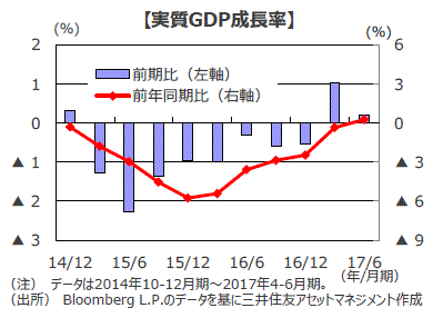 ■2017年4-6月期の実質GDP成長率は前期比+0.2%と、9四半期ぶりにプラスとなった1-3月期に続きプラス成長を確保しました。前年同期比でも+0.3%と、2014年1-3月期以来のプラス成長となりました。