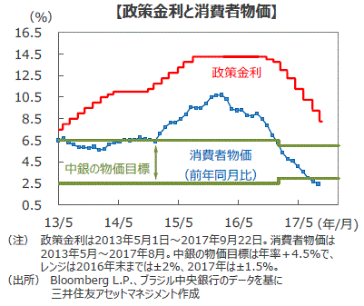 ■ブラジル中央銀行は、インフレ率が大きく低下するなか、16年10月以降利下げを続けています。9月の金融政策委員会では政策金利を8.25%に引き下げました。利下げ幅は累計で6%となり、力強さを欠くブラジル経済の回復を支えています。利下げはもうしばらく継続される見通しです。