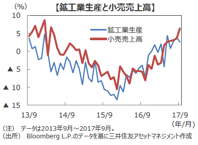 ■9月の鉱工業生産は前年同月比+2.6%と、8月の同+3.9%に続き、増加基調となっています。また、9月の小売売上高は同+6.4%と、8月の同+3.6%から伸びが加速しました。ブラジル経済は生産と消費の両面で順調に回復しています。