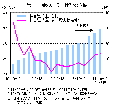 今後の増益率は上昇傾向が続き、今年後半には二桁増に回復する見通しです。2014年通年では、前年比+10.4%の増益が見込まれています(トムソン・ロイターの24日付集計)。世界的に景気が持ち直す見通しであることがその主な背景です。リスク要因として、FRBの金融緩和策縮小により市場金利が上昇することで企業の資金調達コストや投資マインドに影響することや、いくつかの新興国で混迷を深める政情不安が事業に影響を与える場合などに注意が必要です。