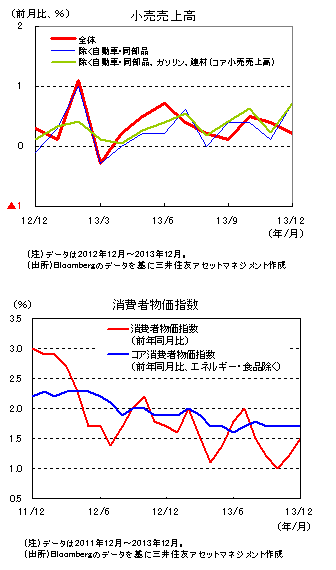 12月の小売売上高は前月比+0.2%と、11月からやや鈍化しました。自動車・同部品が寒波の影響などから減少したことが主因とみられます。自動車・同部品を除いた小売売上高は同+0.7%と、堅調に増加しました。