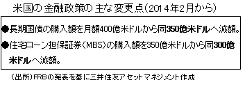 FRBは1月28日~29日のFOMCにおいて、雇用見通しの改善などから、QE3縮小の継続を決定しました。資産購入額は1月実施の月額750億米ドルから、2月には同650億米ドルへ減額する方針です。減額の内訳は、長期国債が400億米ドルから350億米ドルに、住宅ローン担保証券(MBS)が350億米ドルから300億米ドルにそれぞれ減額されます。