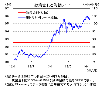 今回のFOMCについては、足元の新興国市場の動揺などに対するFRBの評価や政策判断への影響などが注目されていましたが、声明では特に言及はありませんでした。また、寒波の影響などから米国の経済指標は足元でやや悪化していますが、声明では米国経済は回復基調にあるとの判断が維持されました。FRBは、今後も主に国内状況を基に政策判断を行い、QE3の縮小を続けると思われます。ただし、緩慢な物価上昇を引き続き警戒していることなどから、QE3の縮小は経済指標を確認しつつ慎重に実施するとともに、ゼロ金利政策は当面続けると見込まれます。