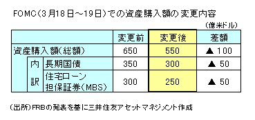 FRBは3月18日~19日のFOMCにおいて、QE3縮小の継続を決定しました。資産購入額は月額650億米ドルから同550億米ドルへ減額となります。長期国債が350億米ドルから300億米ドルに、住宅ローン担保証券(MBS)が300億米ドルから250億米ドルに各々減額されます。