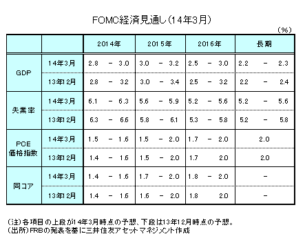 今回変更されたフォワード・ガイダンスは、雇用、インフレ、金融市場などを幅広く検討したうえで、「インフレ見通しが2%を下回り、インフレ期待が抑制されている場合は、ゼロ金利政策をQE3終了後もかなりの期間継続する」といった内容です。従来のガイダンスにあったゼロ金利解除の目安である6.5%の失業率水準は削除されました。失業率は2月で6.7%と急速に低下し、目安として形骸化していたことが背景です。