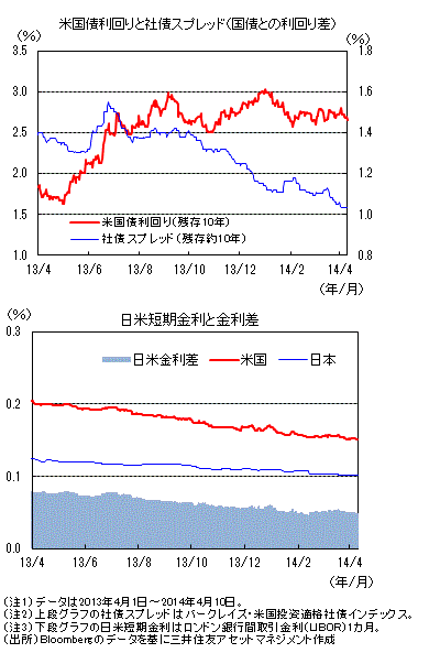 3月中旬から4月上旬にかけて発表された米国の経済指標は、寒波の影響が一巡し、堅調な回復を示しました。FOMC後の会見でイエレンFRB議長は、QE3が終了した後のゼロ金利政策解除の時期について、6カ月程度と言及したことから、市場では利上げ観測が早まりました。これらのことから、米国の10年国債利回りは上昇しました。一方で、ロシアによるクリミア編入などにより地政学的リスクが高まったことは、米国の10年国債利回りの低下要因となりました。足元でも同国東部で再び緊張が高まっており、米国の10年国債利回りの低下要因となっています。こうしたことから、米国の10年国債利回りは直近1カ月程度では2.65%から2.80%のレンジ圏での推移となりました。