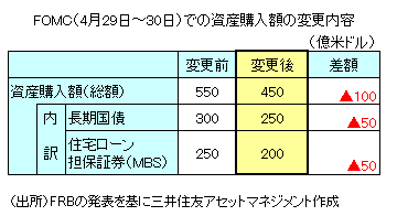 FRBは4月29日~30日のFOMCにおいて、QEの縮小継続を決定しました。資産購入額は月額550億米ドルから450億米ドルへと減額されます。内訳は、長期国債が300億米ドルから250億米ドル、住宅ローン担保証券(MBS)が250億米ドルから200億米ドルとなります。QEの縮小継続とそのペースは市場の予想通りでした。また、政策金利を0~0.25%とするゼロ金利政策は維持されました。