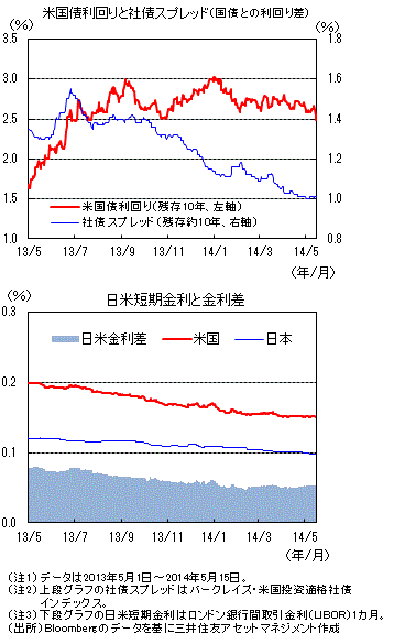 経済指標をみると、4月の雇用統計やISM景況感指数は良好な結果となる一方、1-3月期のGDP成長率や、4月の小売売上高、鉱工業生産指数などは下振れました。また消費者物価指数の上昇率は上向いてきたものの、FRBが目標とする個人消費支出物価指数の上昇率は低位にとどまっています。イエレンFRB議長は議会証言などで物価や雇用など経済回復が強まるまで低金利政策を維持する旨を発言しています。