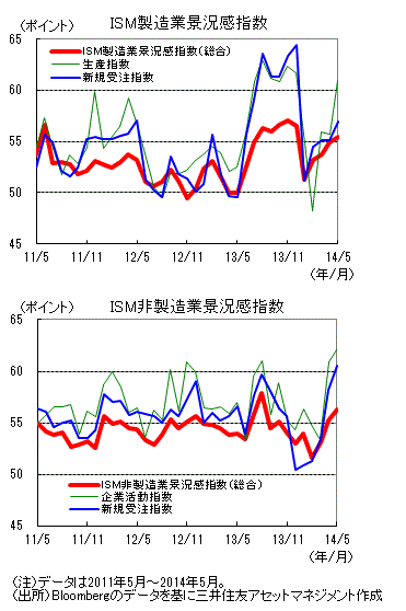 ・5月のISM景況感指数は製造業が55.4ポイント、非製造業が56.3ポイントと、ともに前月から上昇しました。