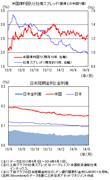 米国の10年国債は、米国の1-3月期GDP成長率の改定値がマイナス成長へと下方修正されたことや、ドイツの失業者数が予想外に増加しECBの追加緩和期待が高まったことなどから、5月末にかけて利回りが低下しました。しかし、6月に入ってからは、5月のISM景況感指数や雇用統計、中国のPMIなどが堅調な結果となったほか、ベージュブックでは広範囲にわたり経済の緩やかな拡大が報告され、景気回復期待が高まったことから、米国債利回りは上昇しました。また、ウクライナ政府が親ロシア派武装勢力との停戦についてロシアなどと協議を進めると報道されるなど、地政学的リスクに落ち着きがみられ始めたことも、国債利回りの上昇要因となりました。