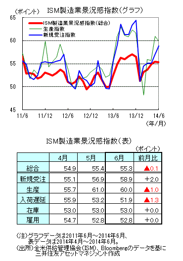 ・6月のISM製造業景況感指数は55.3ポイントと小幅に低下しましたが、好調な水準を維持しました。