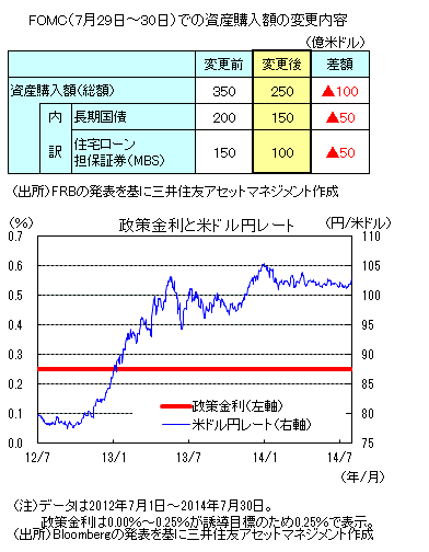 FRBは7月29日~30日のFOMCにおいて、QEの縮小継続を決定しました。8月以降、資産購入額は月額350億米ドルから250億米ドルに減額されます。内訳は、長期国債が200億米ドルから150億米ドル、住宅ローン担保証券(MBS)が150億米ドルから100億米ドルにそれぞれ減額されます。また、政策金利を0~0.25%とするゼロ金利政策の維持を決定しました。
