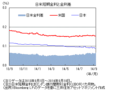 ■短期金利の動きをロンドン銀行間取引金利(LIBOR)でみると、日本では景気回復のもたつきから追加金融緩和観測が高まり金利が低下する一方、米国では当面現在の低金利が続くと見られており、日米金利差は緩やかに拡大しました。